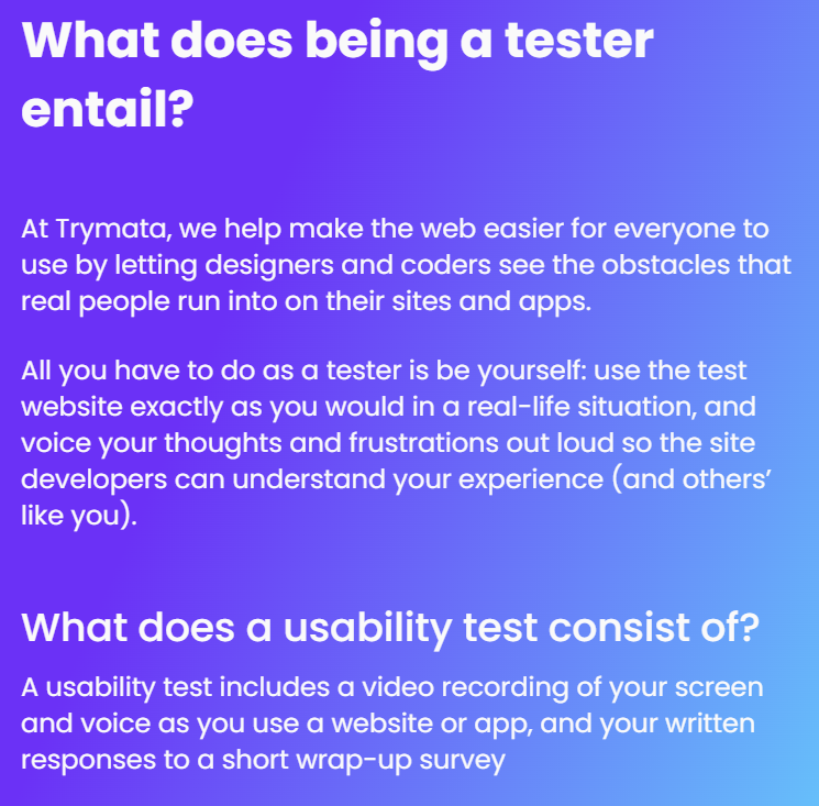 No Special Skills Required: You don't need any specific technical skills or prior experience to become a Trymata tester. Basic computer literacy and the ability to clearly articulate your thoughts are sufficient.